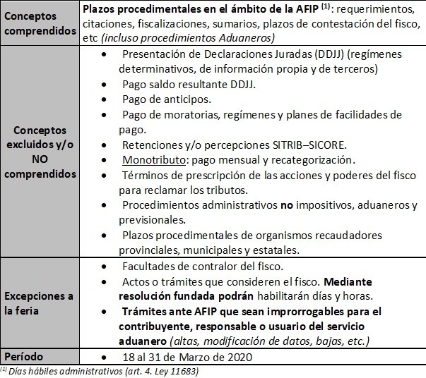 Fundado en la emergencia mundial sanitaria de la propagación del coronavirus (COVID-19) y únicamente en lo dispuesto por la Corte Suprema de Justicia de la Nación declarando inhábiles los días 16 al 31 de marzo para las actuaciones judiciales ante todos los tribunales que integran el Poder Judicial de la Nación (Acordada 4/2020), el fisco nacional dispuso análoga medidas y con los tradicionales efectos limitados al cómputo de los plazos procedimentales en materia recursiva . Incluso, ante diversos rumores, el fisco emitió un comunicado de prensa aclarando sus efectos desde: “Feria fiscal: la AFIP confirma que “la medida no implica ninguna modificación ni prórroga sobre los vencimientos de impuestos”, iProfesional, 18/03/2020