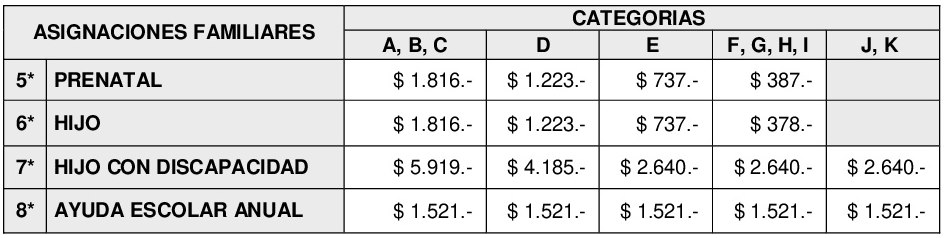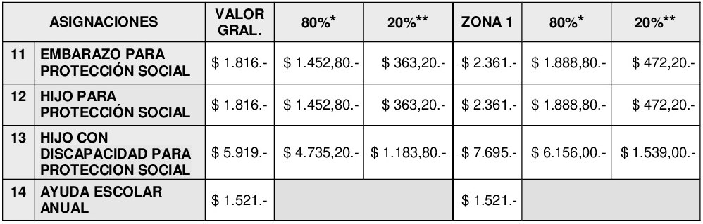 7* y 8*: Trabajadores Monotributistas de las categorías J y K. La Ayuda Escolar Anual sólo corresponde en el caso de Hijo con Discapacidad.