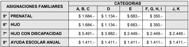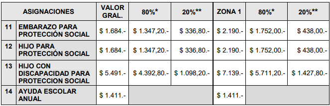 7* y 8*: Trabajadores Monotributistas de las categorías J y K. La Ayuda Escolar Anual sólo corresponde en el caso de Hijo con Discapacidad.