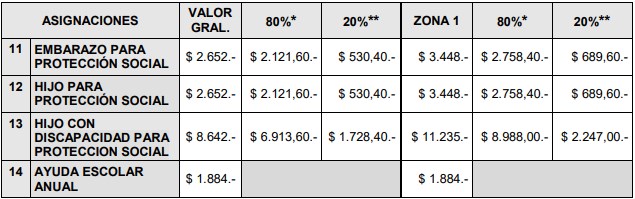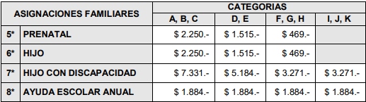 7* y 8*: Trabajadores Monotributistas de las categorías J y K. La Ayuda Escolar Anual sólo corresponde en el caso de Hijo con Discapacidad.