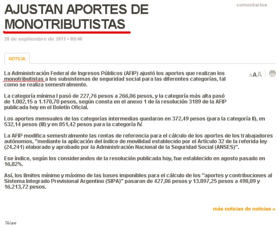 La aclaración, se debe a que a partir de un cable emitido, aparentemente, por la agencia Telam, se tituló la noticia de la publicación del incremento en autónomos, como “AJUSTAN APORTES DE MONOTRIBUTISTAS,” lo que fue tomado por varios portales, entre ellos los diarios económicos Ámbito y El Cronista, sin advertir el error, tanto en la el título como en el cuerpo de la nota. El portal Terra y el diario Los Andes, también se hicieron eco de este mal entendido.