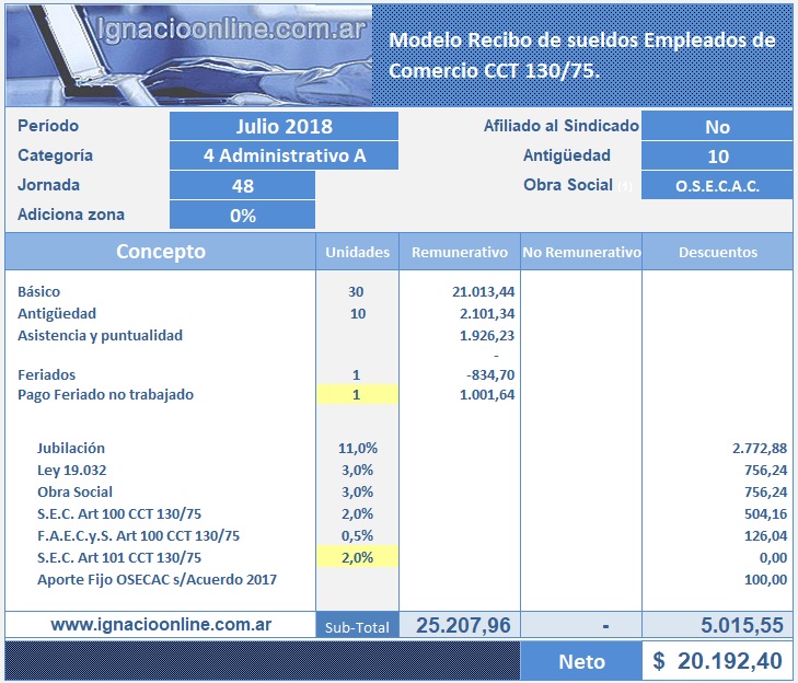 Caso práctico de liquidación de sueldo Julio 2018 para Empleados de Comercio.