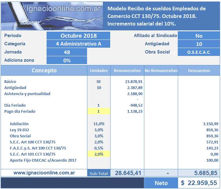 Caso práctico de liquidación de sueldo Octubre 2018 para Empleados de Comercio. Incremento del 10%.