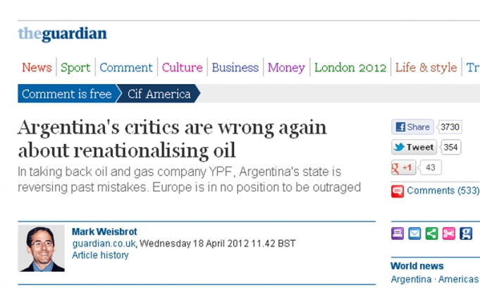 La decisión del Gobierno argentino de recuperar la empresa YPF fue recibida con indignación, amenazas, vaticinios de ira y ruina y ciertos groseros insultos por parte de la prensa internacional. Cosas como éstas, ya se han escuchado antes”. Así comienza la columna de opinión escrita por Mark Weisbrot em la edición del matutino “The Guardian”.