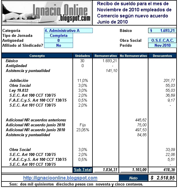 Recibo de Sueldos de empleados de comercio: Liquidación noviembre de 2010