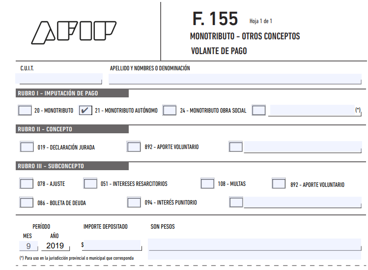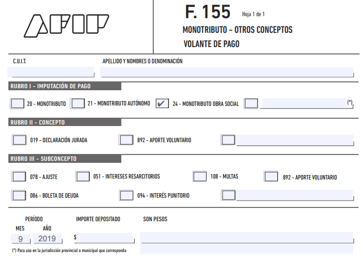 En el supuesto que la citadas entidades no tengan habilitada en sus sistemas de cobro la posibilidad de consignar importe “CERO PESOS” ($ 0) en el componente impositivo, los pequeños contribuyentes podrán utilizar el volante de pago formulario F. 155 –uno por cada obligación-, indicando sólo los importes de las cotizaciones previsionales que correspondan.