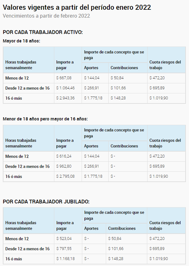 Estos importes entran en vigencia desde el devengado de enero 2022 con vencimientos a partir de febrero 2022.