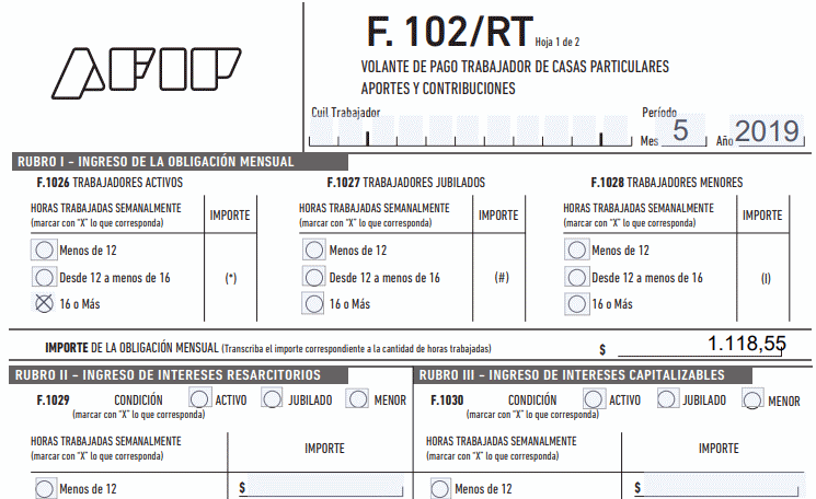 En el formulario AFIP 102/RT para aportes desde abril 2019, para más de 16 hs, sale automáticamente el importe $ 1155,55