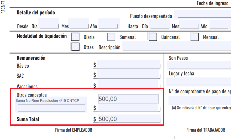 La otra opción para incluir el pago de la suma no remunerativa, es dentro del Formulario 102 RT.