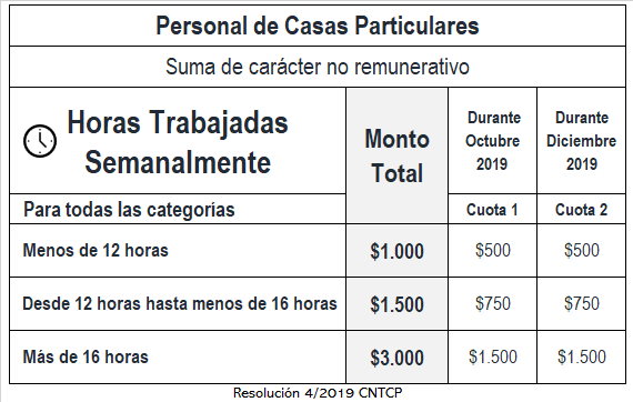Cabe recordar que, la Resolución 4/2019, de la Comisión Nacional de Trabajo En Casas Particulares (CNTCP), estableció el pago una asignación extraordinaria no remunerativa para el Personal comprendido en el Régimen (ex Servicio Doméstico), que se abonará en dos cuotas y de acuerdo a las horas trabajadas en la semana: