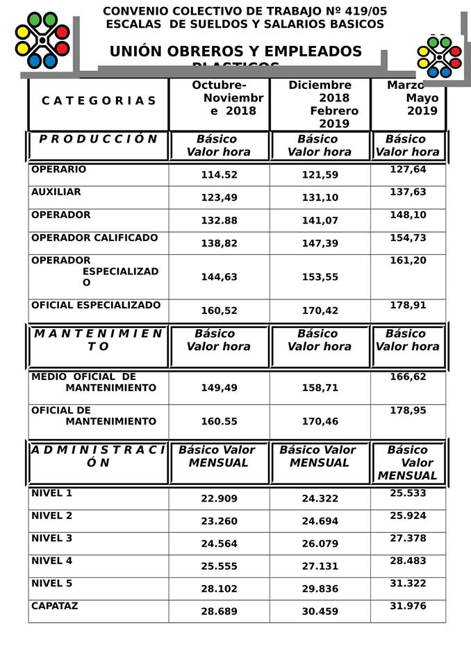 REVISIÓN. Escala salarial 2018 Plásticos Octubre 2018 a mayo 2019 . CCT 419/05 UOYEP.
